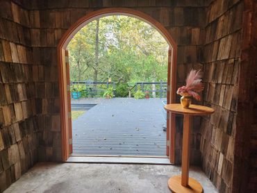 A converted former Girl Scout Hall now has the dazzle of Crystal bling, the rustic nature of antique timbers, and plenty of natural light with massive windows and window garage doors to let the outside in. We are still upgrading the building and space around it to enhance the experience!